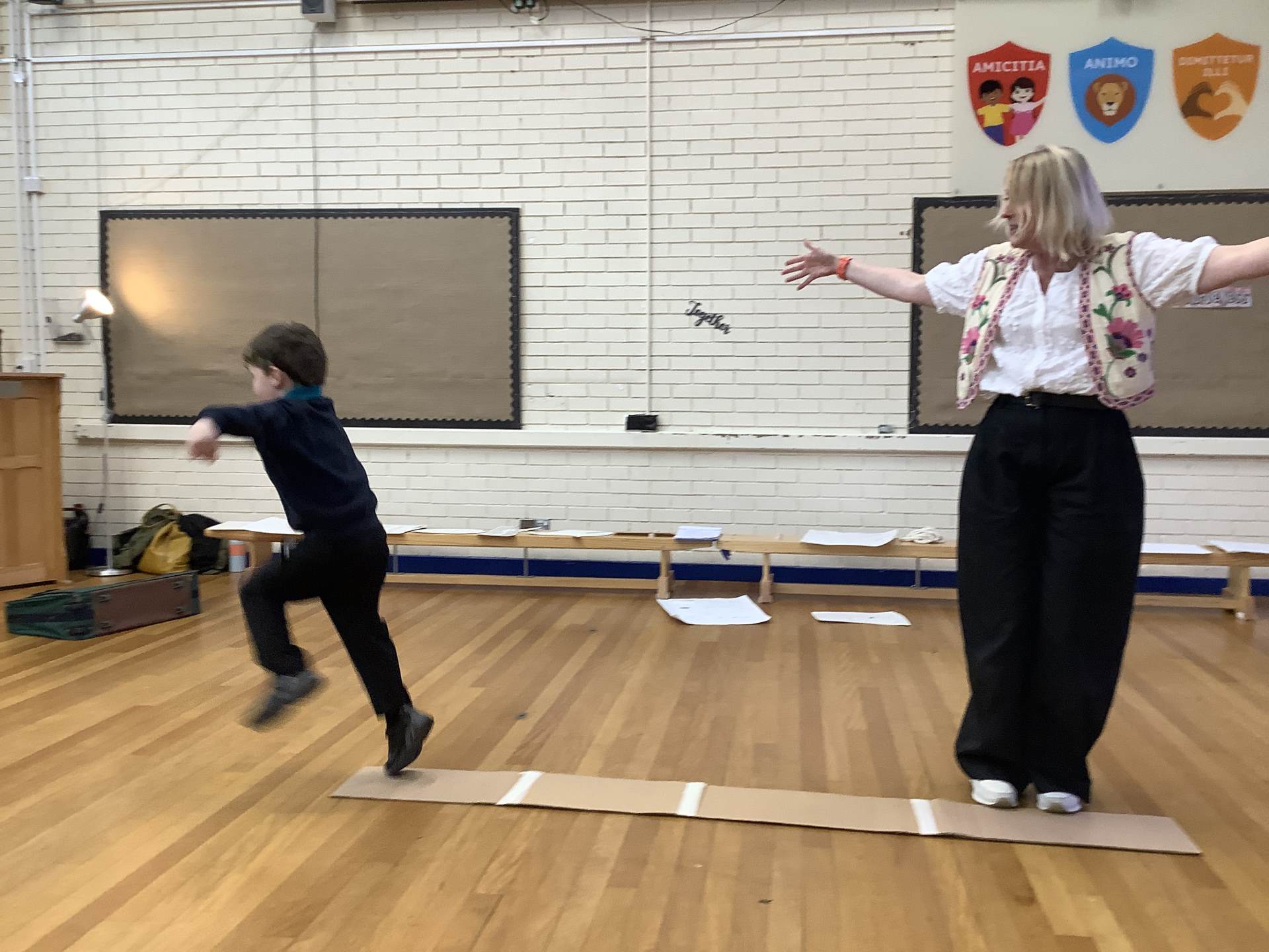 The giant with chocolate on his feet walked in our classroom.